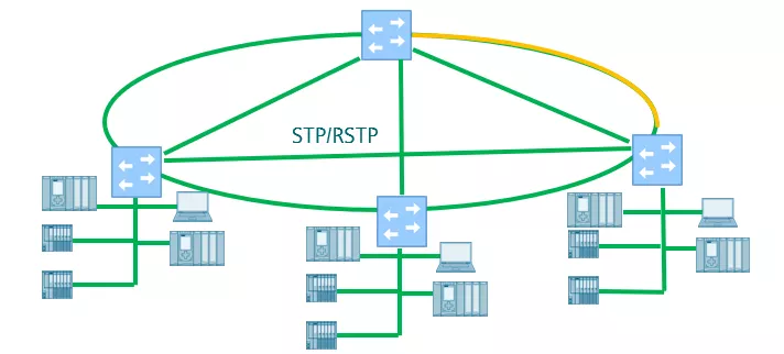 STP(Spanning Tree Protocol,生成树算法,IEEE 802.1D),网络中断恢复时间为30~60s之间。RSTP(快速生成树算法,IEEE 802.1w)作为STP的升级,将网络中断恢复时间,缩短到1~2s。生成树算法网络结构灵活,但存在恢复速度慢的缺点。