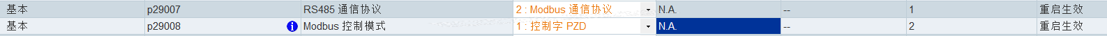 2、还是重启惹的祸,如果选择了控制模式为:1:控制字PZD,那么这个驱动则无法从端子启动,只能用通信启动,而且就算改成无控制字但没有重启,端子依然无法启动(大大的坑)