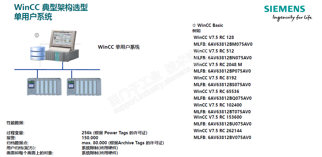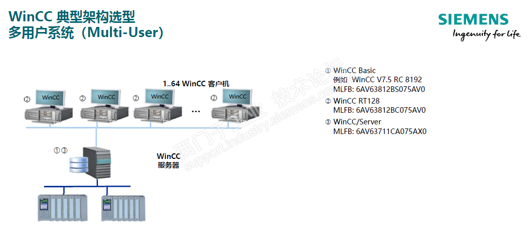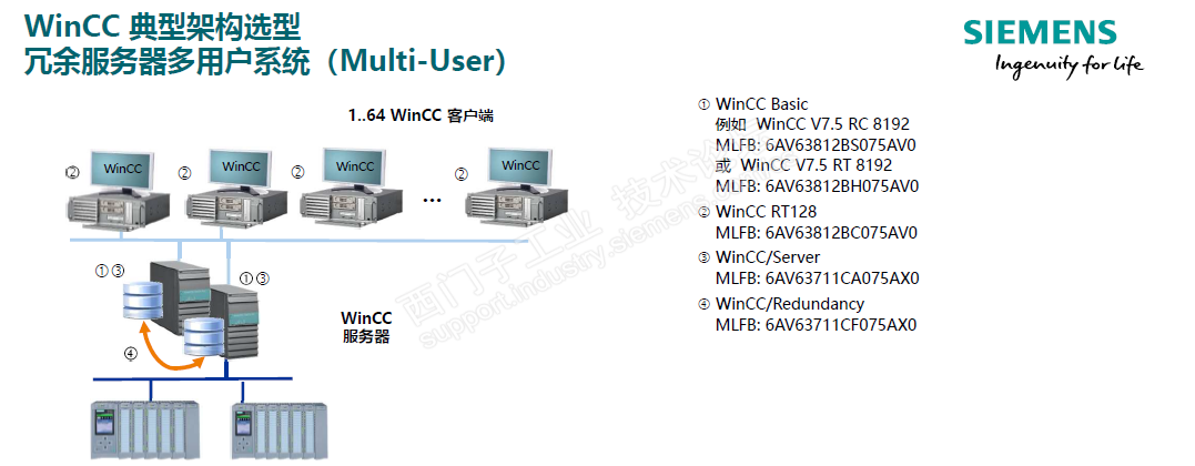 最近遇见的问题比较多,昨天一个客户打电话说自己买了一个WINCC 7.5 RC 8192和一个WINCC 7.5 RT 8192,软件正常安装后导入授权,插上硬狗,打开软件时报缺少SERVER授权,自动切换至演示模式。这是什么情况呢?客户下位是414-5H冗余系统,电脑系统是WIN10系统 2018 企业版。WINCC 7.5常见的典型架构无非是下面几种: