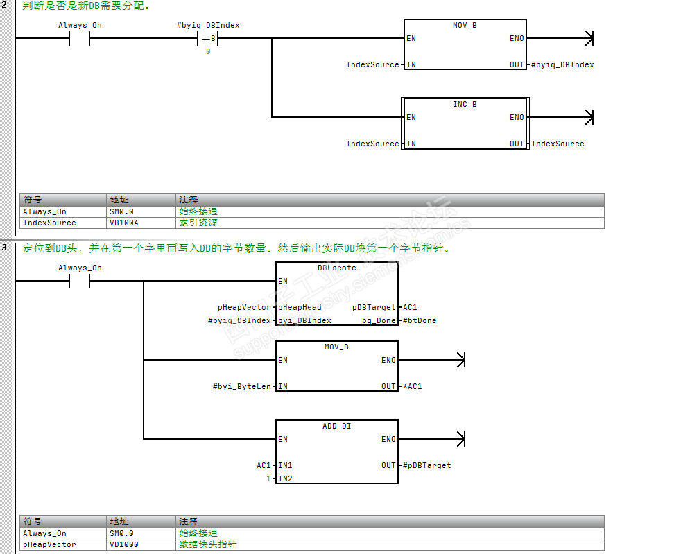 DB_Malloc用在用户子程序开头部分,用于分配DB块和定位DB块。分配块只在第一次扫描到该子程序时才发生,之后的扫描不用重新分配。分配其实是分配最新索引到子程序的索引变量中来。定位也很简单,就是数据块头指针开始的顺序查找。定位单独做成一个子程序,DB_Locata。