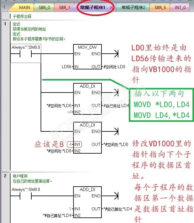 VD1000 &VB1008 &VB1020 指向下个子程序过程数据区的指针
