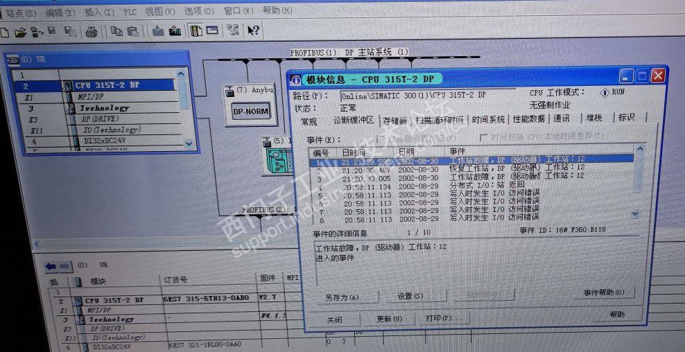 一台315T的CPU,DP2端口直连CU320,这个DP网络12M的,只有CU320这一个DP站,DP号12。DP插头是后面可以插电缆的那种,MPI编程电缆只要一插上DP2上的插头,或者CU320上的插头,CPU就会DP2号网络报警,PG接口扫描,也只能扫到315的CPU,无法扫描到12号CU320站点。