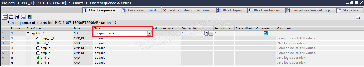 将CFC_1的Task(任务)更改为Program cycle(程序循环),即每个扫描周期执行一次。其它参数不要改。如Enable chart参数,改动后无法复原,只能把这个CFC删除重建。