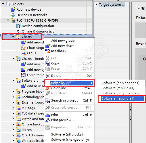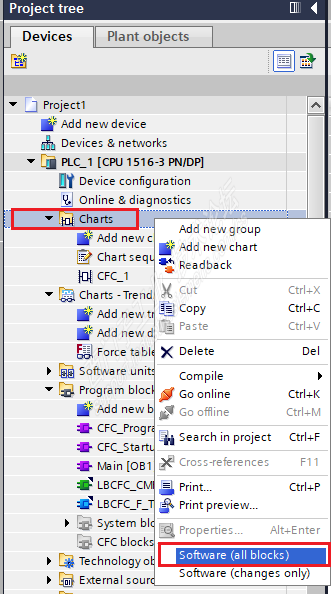 一定先启动PLCSim程序,PLCSim程序启动后,选中Charts,单击右键,选择Softwart(all blocks),将CFC程序下载到PLC中。CFC程序运行与main(OB1)是独立的。按照main(OB1)的方法无法下载CFC程序。