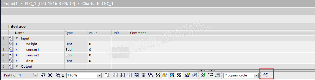 点击“Go online”(在线),将PLC在线,监控CFC 的运行。