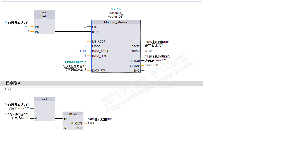 用一个CMPTP模块与5台国产变频器485通讯读写数据,自己写了个程序轮询读写5个站点的数据,举例如下,设置一个用于存储步骤号的变量,当前步骤的读写操作无论成功还是失败都使步骤号加1,进行下一步的读写操作,能够实现轮询读写这5个变频器的数据,唯一的问题的是,发现对每个变频器的数据操作都很慢,PLC运行时的扫描周期看着是3ms,我给任意一个变频器写入启动指令,都会反应几秒才能写入到变频器,监控时可以看到轮询的步骤号基本上是1s加1一次,感觉不应该这么慢啊。