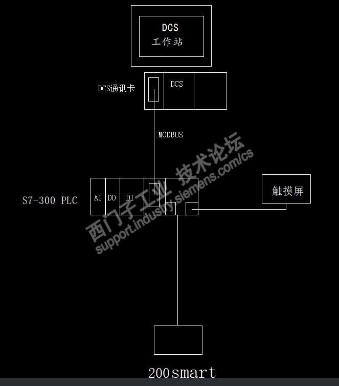 这是一个改造项目,现场的CPU315-2DP已经使用超过15年,因为客户无改造计划,目前仍在使用,CPU315-2DP做DP主站,200smart做DP从站替换原来的200CN,300PLC的MPI口上挂的第三方的GP触摸屏,无源程序现场也无法上载、修改,DCS同时做了国产化改造,改成了国产某DCS厂家的组态,如下: