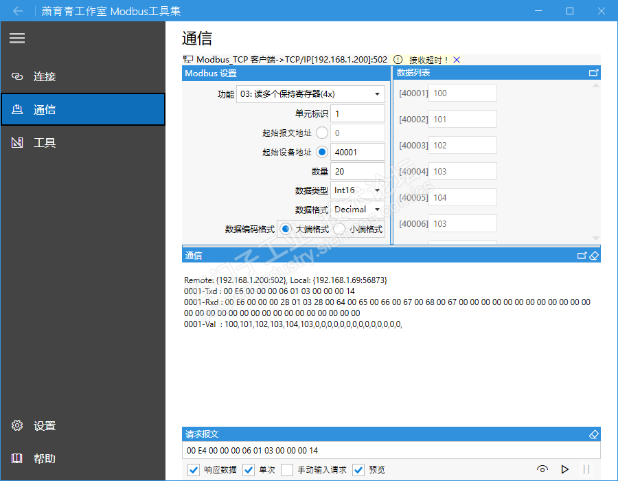 1. 建议调大“响应超时”试试,确保 客户端的“响应超时”大于服务器的发送周期;