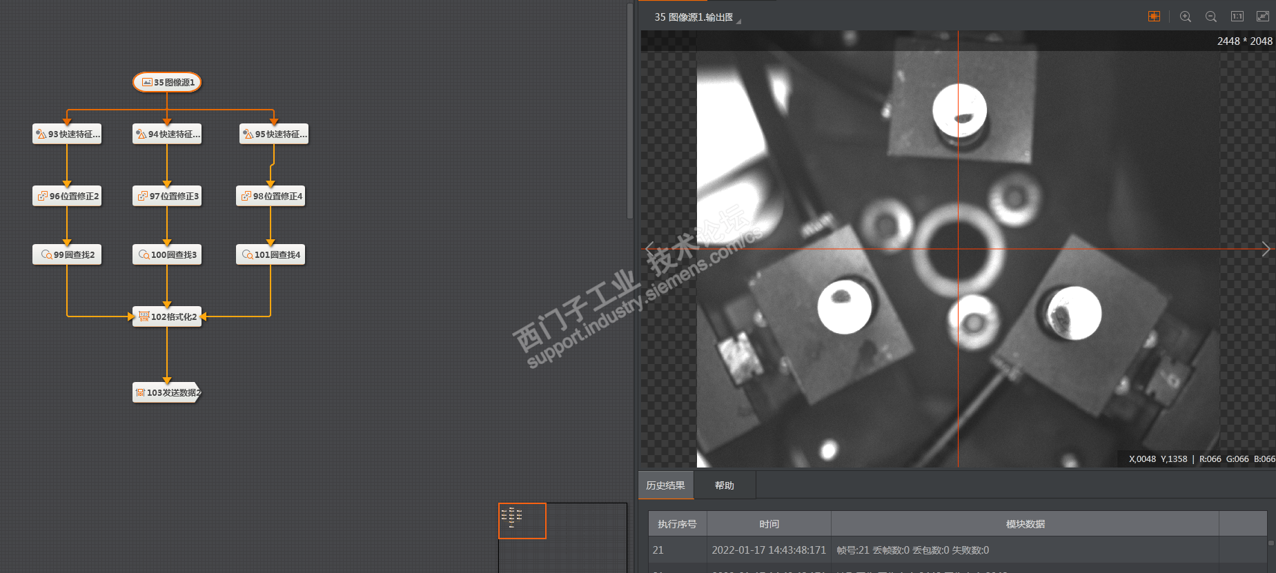 3个工件所涵盖的面积,正好铺满相机视野的约2/3,且3个工件的反射面都具有典型特征值(明显的亮度区别),这就不需要再做图像增强处理,直接抓取特征值即可