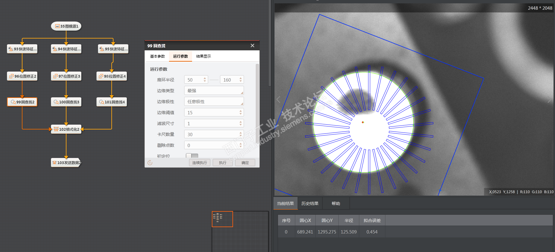 圆形查找的半径125像素(工件物理直径7mm),圆形拟合误差0.45像素,相机视觉软件返回的结果是令人满意的。