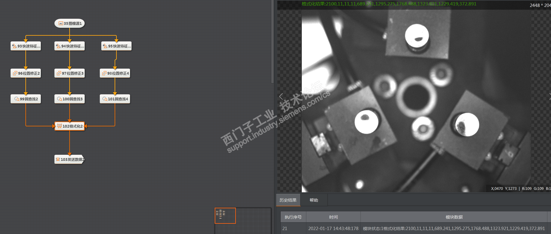 格式化通信编码的规则:第一位2100代表信道,表示发送给1#机器人;第二、三、四位数据分别表示3个工件识别结果,如果任意一个为0,机器人就要卸载掉工件,重新抓取一个工件再次拍照;第四位开始是3个工件的XY像素坐标值。位之间用逗号分隔。