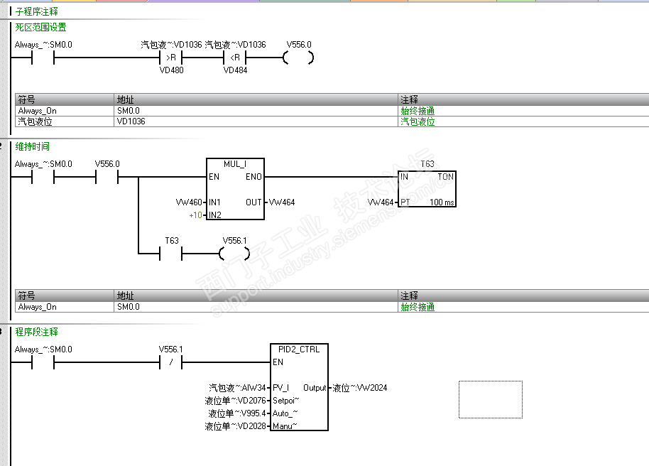 比如用液位控制进水阀的开度,我想在目标液位的上下设置一个区域,当实际液位维持在该区域内一定时间后,接通一个标志位。我之前是把这个标志位加在了PID指令的使能端,相当于液位处于死区时,PID指令不执行了,输出也不变了,阀的开度就恒定了。感觉这样做不行,后来又想,用这个标志位的沿命令,把PID的输出传送,当液位不在死区后,再把PID输出一直传送。不知道这样行不行?