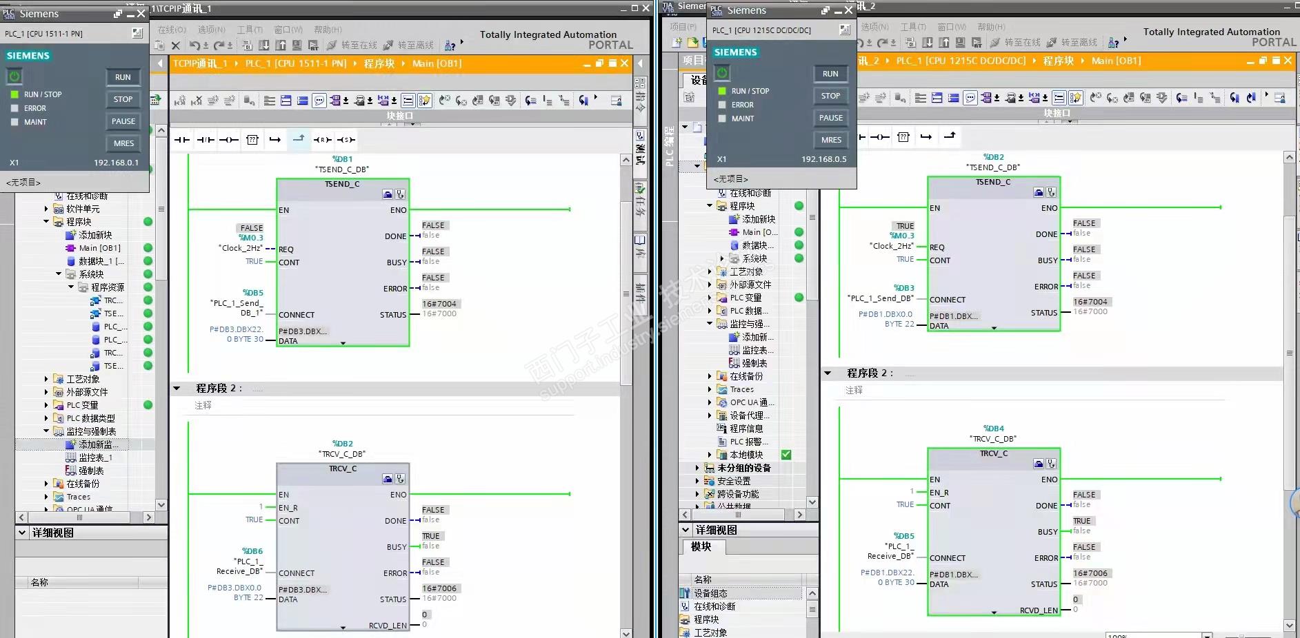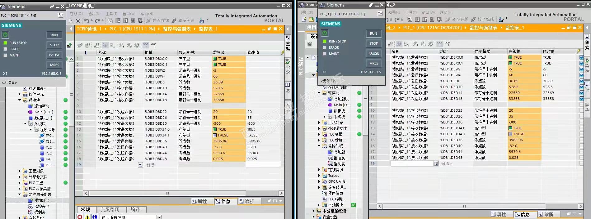 博图可以支持同时两个程序的在线仿真,可以仿真两个PLC的以太网TCP/IP和PUT/GET通讯。通讯时以字节为单位传送,数据可以是BOOL、BYTE、Int、DInt、Real等数据的混合数据,通讯时只需要对应好相应顺序就行,数据DB要取消优化。
