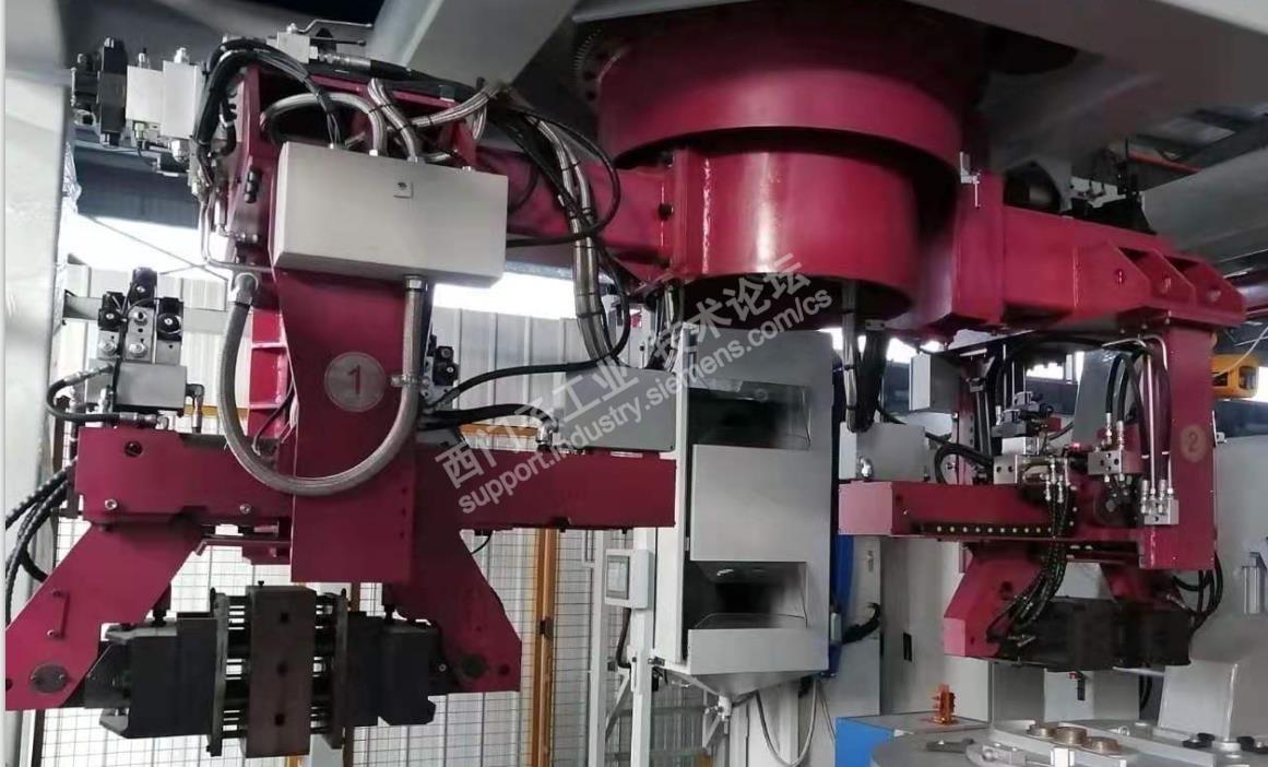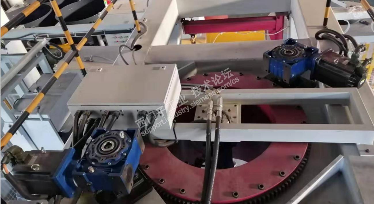 两个工位围绕同一个中心旋转,顶部用减速机+齿盘驱动