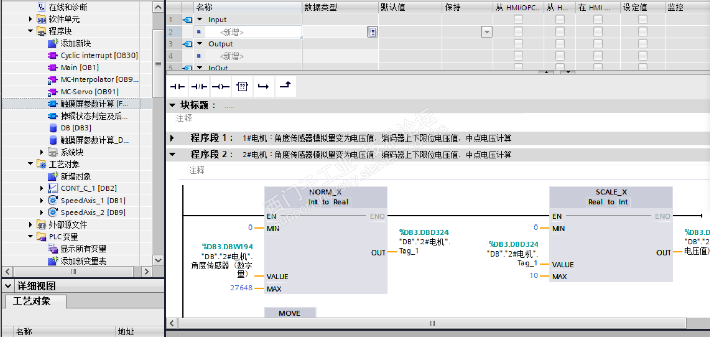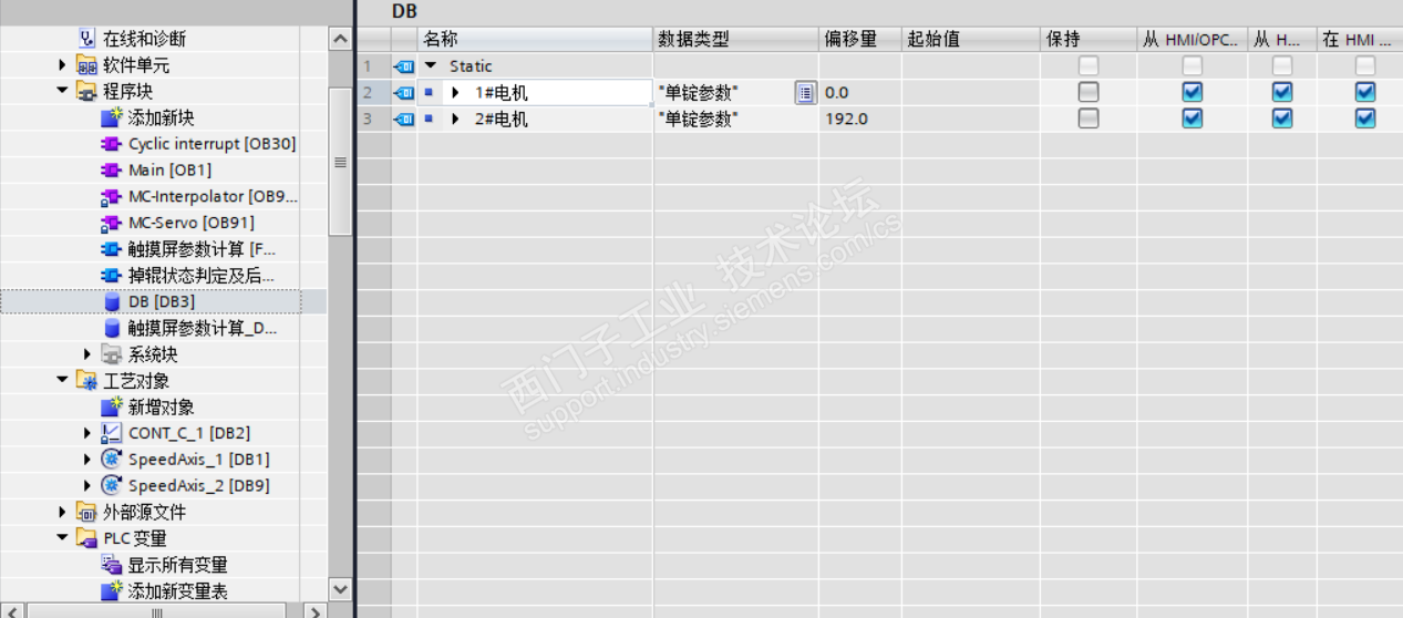 楼主是个工控小白,网上的控制多轴的资料翻烂了,也没有找到一个实用的。目前想的编程的方法如图所示,建立了一个名为“单锭参数”的PLC数据类型,在新建的DB里新建两个“单锭参数”,取名为1#电机和2#电机。在程序里,写入2个一样的程序,只是把类似:“DB.1#电机”改为“DB.2#电机”,偏移量不同,对应不同的电机,到这里都很顺利。