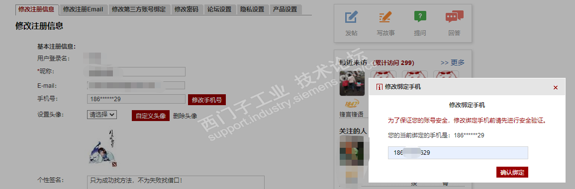 西门子技术论坛在个人中心更换手机号时页面呈灰色不动弹了,换了好几个浏览器都不成功,如图,前写完信息确认修改后就没反应了
