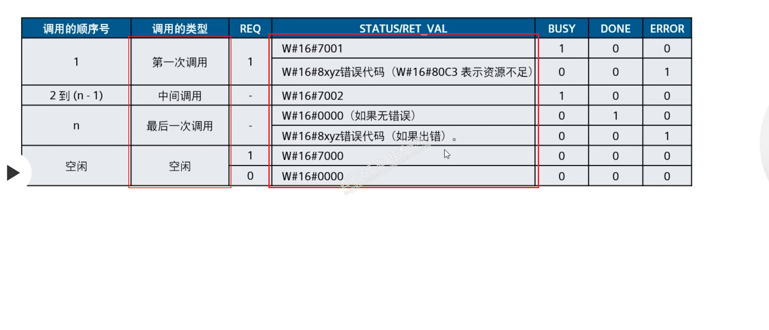 正如课程中所讲,异步指令需要多个周期的执行才完成,不同状态对应不同第次的指令调用或者故障状态,如下图所示,比如16#7001表示第一次指令调用。16#80C3在这里只是举了个例子,具体错误含义,需要查各自的指令。