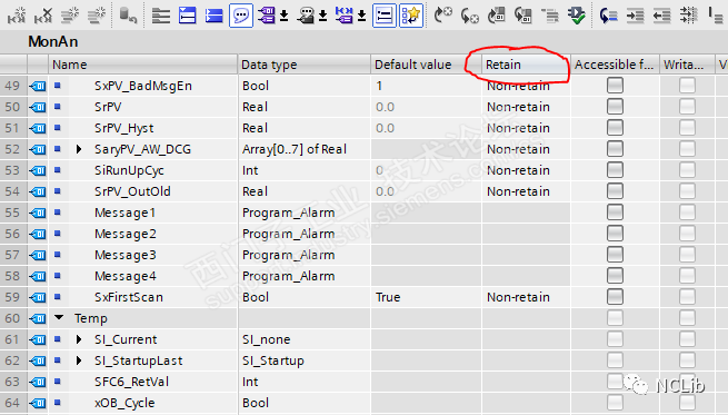 但TIA Portal对于S7-1500中FB的保持性与经典STEP 7的S7-300/400不同,TIA如果勾选了优化块的访问,则FB编辑列会出现保持选项。如果选择不保持,CPU在暖启动Stop到Run时,SxFirstScan会有0到1的跳变,如果选择保持,当复位后,下次CPU暖启动等会保持为0,并不会执行你认为的初始化程序段。对于STEP 7中S7-300/400来说,所有的静态变量区都是保持的。