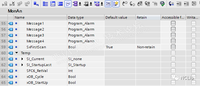 鉴于上述情况,如果我们希望静态变量区的数值都是保持的,可以取消块的优化访问,可以通过SFC6 “RD_SINFO”读取CPU当前执行的OB来进行程序初始化。如图在Temp临时变量区创建以下变量: