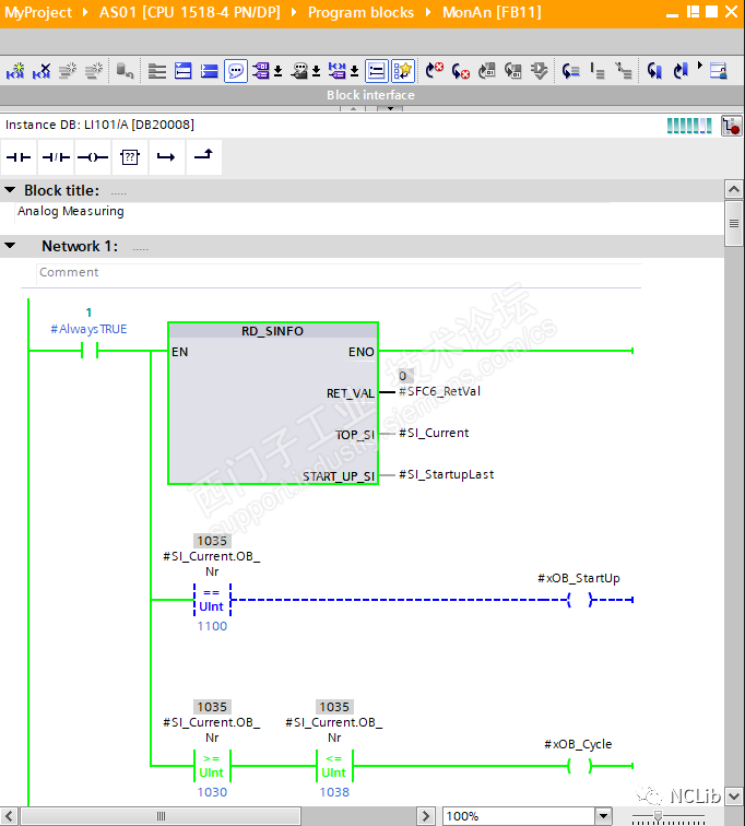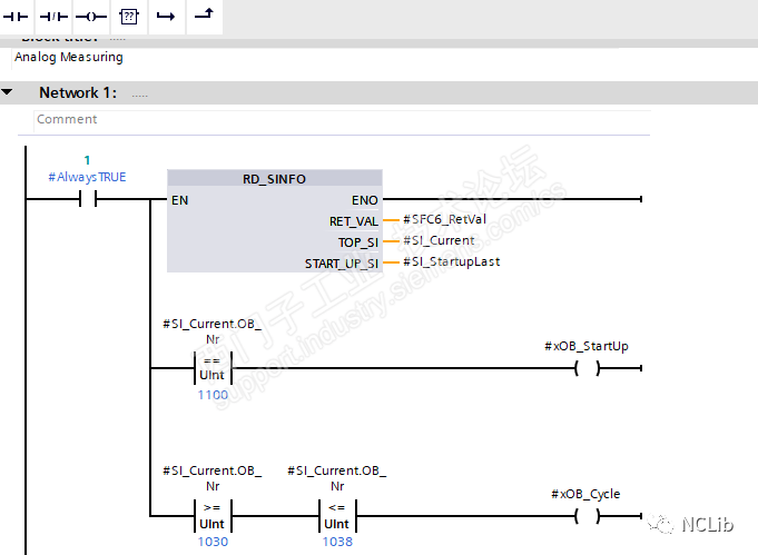 调用SFC6,在变量SI_Current.OB_Nr中的值就是程序在CPU当前执行OB的编号,对于TIA CFC的OB编号来说,OB编号需要增加1000,如启动OB100在CFC的编号是1100,因此下图程序中xOB_StartUp只会在功能块被OB调用后接通一周期。