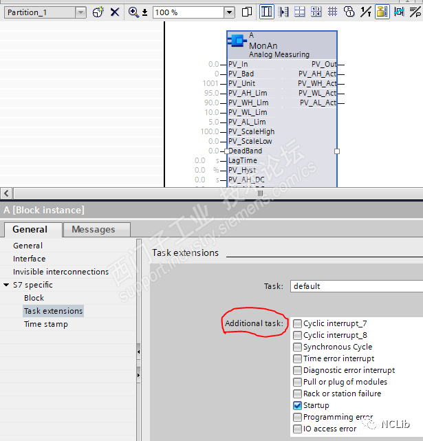 回到CFC,我们拖拽FB功能块到CFC编辑界面,在块属性中S7 specific > Task extensions > Additional task 中勾选Startup,为块添加启动附加任务后,功能块FB会被在CPU启动执行一次调用。
