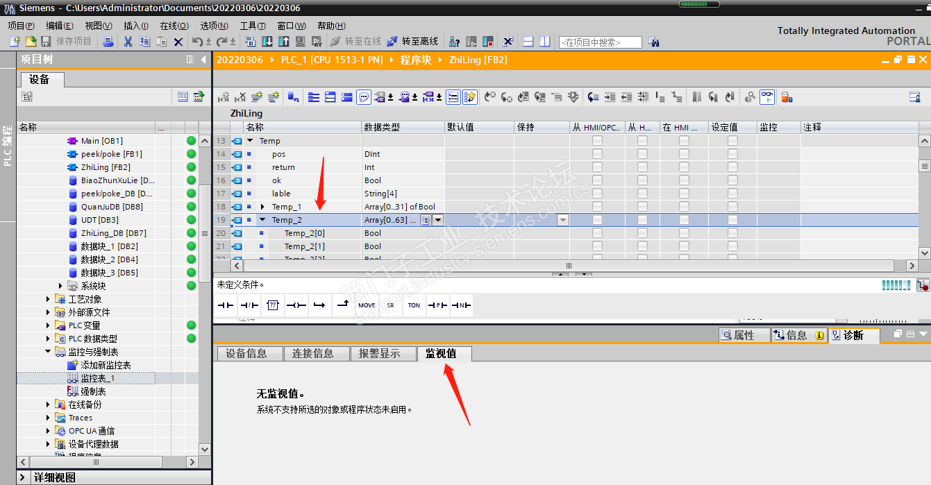 请问老师,FB块中TEMP区中的复杂数据类型能监控吗?在哪里能监控?