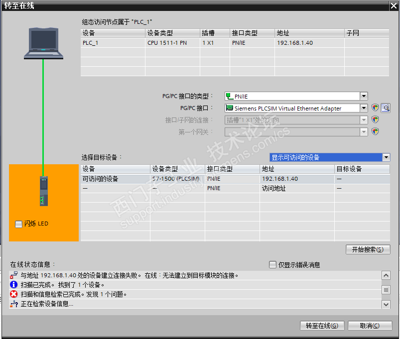 PLCSIM创建节点启动之后,通过TIA 搜索到S7-1500(PLCSIM)点击转至在线,显示连接失败。