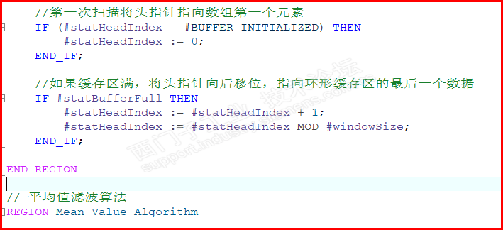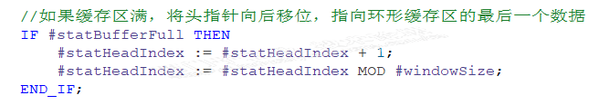 还有就是这段程序是保证在满队状态下把头指针加1,然后进行滤波处理,下一周期有新值进来覆盖队列0号位置,同时尾指针后移,指向队列中1的位置,然后尾指针与上周期头指针(指向1的位置)作对比判断队列为满对,然后把翻转标志置位,因翻转标志位为1,所以头指针加一,与下周期的尾指针作比较继续判断队列是否满对,程序往下运行因翻转标志位1,所以可以进行滤波操作,这样可以每当有新值存入都是满对状态,这样就可以连续的做滤波操作,