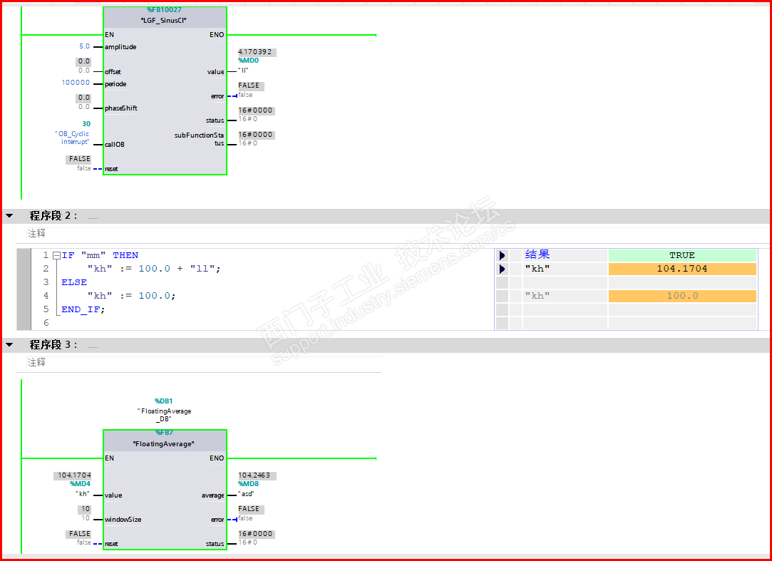 请问老师能放一下2.1.4平均值滤波算法之外的程序吗? 就是调用平均值滤波算法的程序,产生干扰信号的FB正弦波形程序中的OB的形参,就是循环中断里面调用的程序具体是什么,仿真时没达到预想的结果