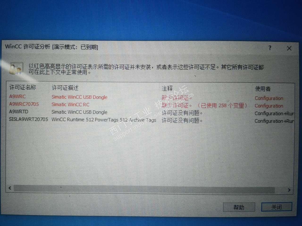 WIN10系统下利用autostart工具做开机自动启动项目,偶尔会遇到开机无法自动启动的情况,桌面不出现启动进度条。此时右下角wincc图标带一个红色的角。检查许可证,多了两行红色的许可证异常。运行版电子狗一直是插着的。重启一次电脑后,均可以正常启动项目。