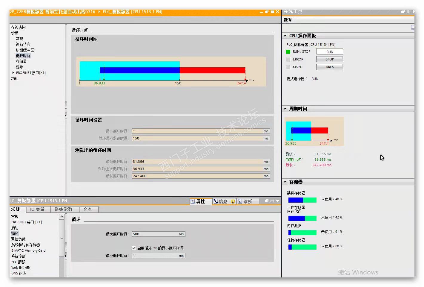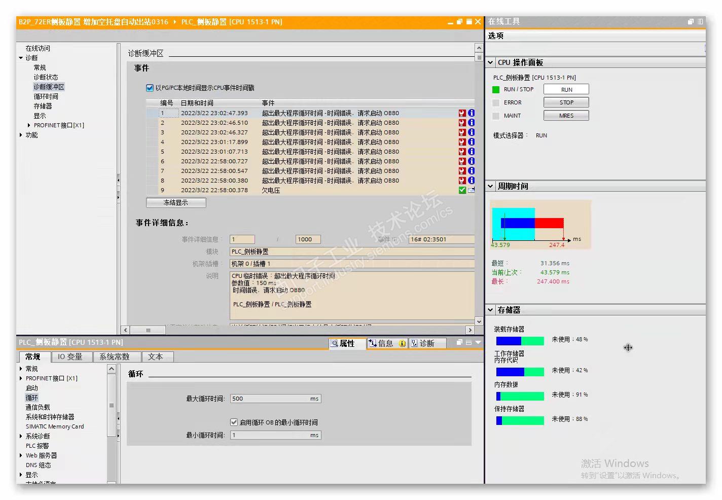 老师好!我PLC下面挂了10几个PN分布式I/O设备,报“超出最大程序循环时间”错误时,经常会出现掉站的情况,我修改最大程序循环时间500ms后,为什么循环监控时间的数值还是150ms呢?