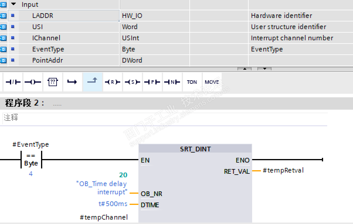 二、示例程序的整体逻辑,我是这样理解的,AI通道如果有触发硬件中断的事件,那么启动硬件中断OB40,OB40再判断触发类型,决定是开启延时中断还是取消延时中断,如果开启延时中断就置位延时中断OB20中的M4.0.那么那个#sign管脚怎么理解?不是触发延时到了就置位吗?