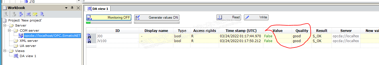 目前 OPC SCOUT V10 测试通讯质量为Good,