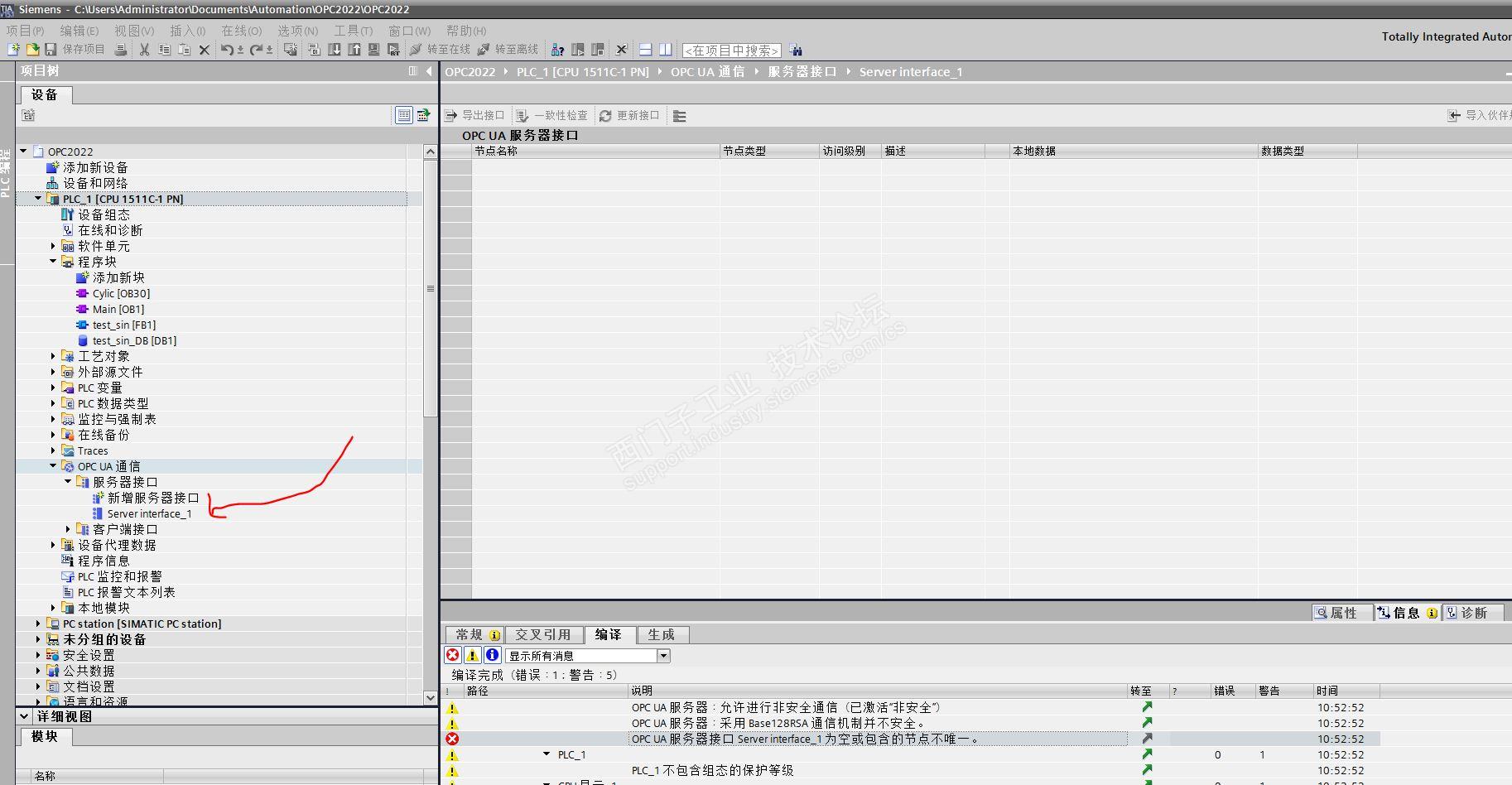 我以1511CPU为平台,激活OPC UA服务器,使用UaExpert做客户端,按照OPC UA服务器设置步骤,到设置服务器接口的时候就不对劲了,编译报错:OPC UA 服务器接口 Server interface_1 为空或包含的节点不唯一。可是打开服务器接口设置却发现不能设置任何参数,看示例中这个里面应该有参数的,不知道是哪个里面没有弄对,恳请有弄过这个大佬,能够指点一下,感谢!