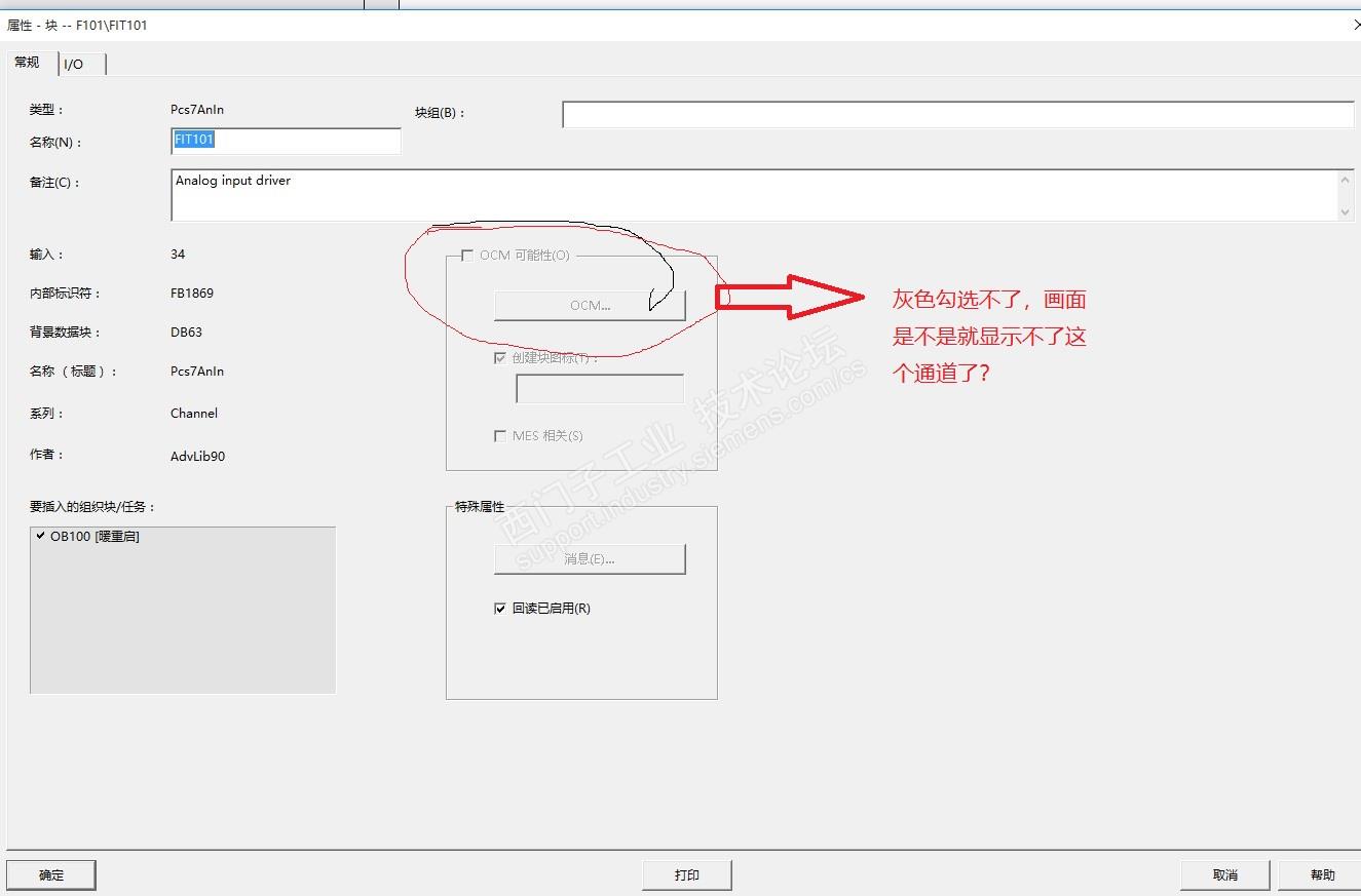 PCS7 CFC Pcs7AnIn块无法勾选OCM,OS编译WINCC画面就没有这个通道显示,CFC建了三个块只有PID那个块有图标,PID那个块OCM选项可以勾选。那两个OCM选项灰色的,什么原因。