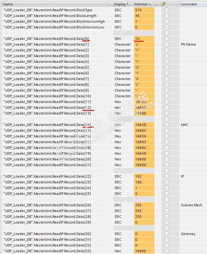 用RDREC指令可以读Profinet的很多信息。下面这个模块可以读取PN名称,MAC地址,IP地址,子网掩码、网关,然后把获得的这些信息拷贝进一个UDT里面。V14 SP1