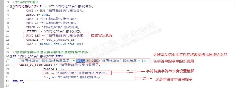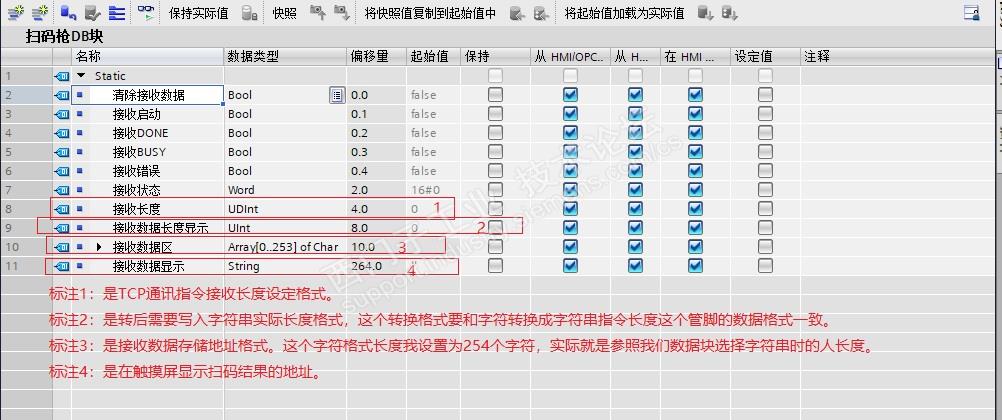 手持式扫码枪是扫二维码,通讯数据都是字符串格式。扫码枪做客户端,PLC做服务器端。首先用网关软件设置客户端参数,和扫码枪通讯的波特率,这不比较简单,而且每家网关制造商都不一样,我就不截图说明,网关是买深圳三旺这家公司的产品,型号是NP302T系列串口服务器。设置完网关的参数后,再到PLC建立通讯接收数据DB块。接收数据格式你可以设置成字符(Char)数组格式或是字符串(String)格式。我下面图一是设置字符格式,图二是字符串格式,图二是另一款产品通讯也是有和喷码机一样的问题,处理方法都是一样。下图是我两个TCP通讯的DB块地址,两个产品不是一样,但是都是同样问题,处理方法思路一样,程序编程稍有不同。由于调试周期比较紧没有来得及拍照,一些图片无法提供。