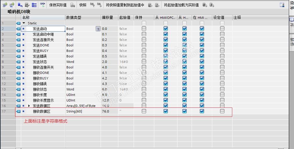 正因为西门子字符串格式是这样,和第三方通讯接接收到字符串格式不是这样,就会导致接收到数据,没有有效长度无法在触摸屏显示。如果是西门子自己产品就不会出现这样问题。出现这样情况就需要自己编程将接收到有效长度写入到字符串有效长度里面后才能通过触摸屏显示出来。触摸屏显示字符串需要有效长度后才能显示字符串来,哪怕你PLC能接收到完整的数据,可以在DB块里面监视到完整数据,只要你字符串里面没有有效长度,就不能再触摸屏显示字符串。这个问题解决方法是西门子触摸屏技术支持提供方法,中途打过几次PLC技术支持没有找打问题,后来PLC技术支持建议打触摸屏技术支持,通过两次和触摸屏电话后来触摸屏支持给了我这样的解决方案,我试了一下就解决。这个问题前后花了我两天时间才解决。解决此问题感谢西门子PLC和触摸屏技术支持。