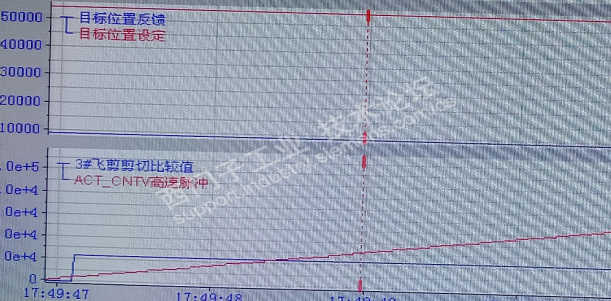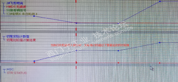 经过分析,认为这种情况的发生与PLC控制器程序执行过程的特点有关,因为程序在循环执行的过程中,当有中断事件发生时,系统会中断当前执行的程序去处理优先级高的中断事件,返回时,现场实际工况已经发生变化,尽管这种变化很微小,但是对于时序控制要求比较高,响应时间要求高,速度变化快的飞剪系统来说,就容易发生异常情况。