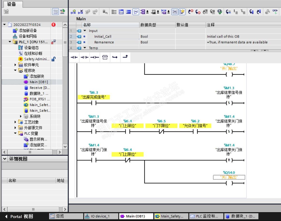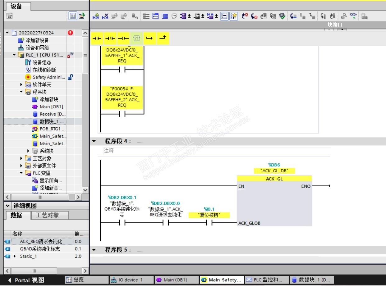 我在主安全程序里写了一个简单的急停指令,然后再把所有IO模块的QBAD并联输出一个系统钝化标志,ACK_REQ并联输出一个请求去钝化标志,再用ACK_REI命令去钝化。结果刚才的俩个标志没法串接到ACK_REI命令输入项时却编译不过,好像说是上面用在输出是写入命令,下面就不能再用作读命令了,太费劲了。