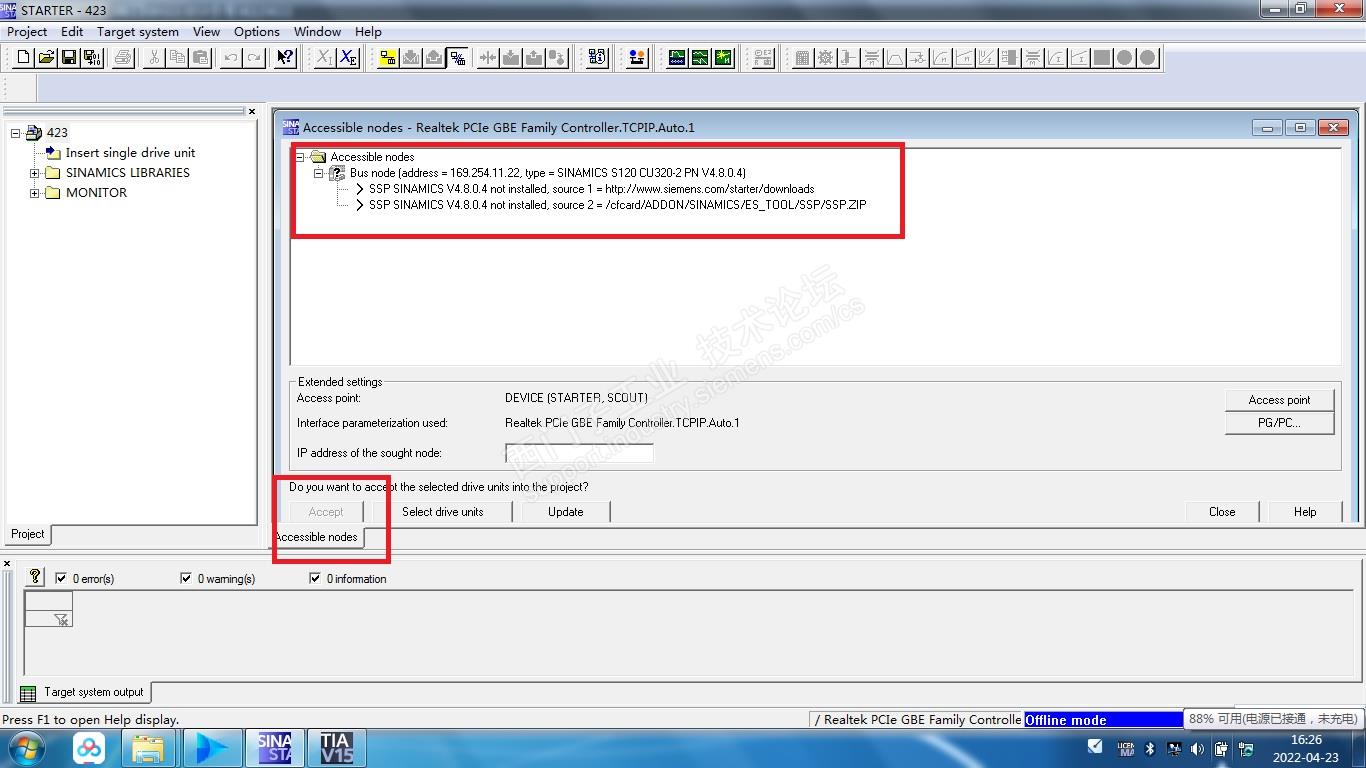 还有一个问题是,在调试过程中,我感觉STARTER的资料多,所以想用这个来调,在连S120在线寻找的时候,能找到驱动但是不能选择这个驱动,Accept那个钮一直是灰色的,也一直不明白这是什么原因造成的。