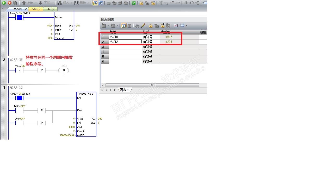 我测试过几种MSG触发方式,如、按顺序在MBUS_CTRL指令下面的同一个周期中,只是把MSG指令写在MBUS_CTRL指令的下面网络,通讯仍然可以正常轮询,而不一定需要通过2个周期(在同一个周期,不同的网络中照样可以)。