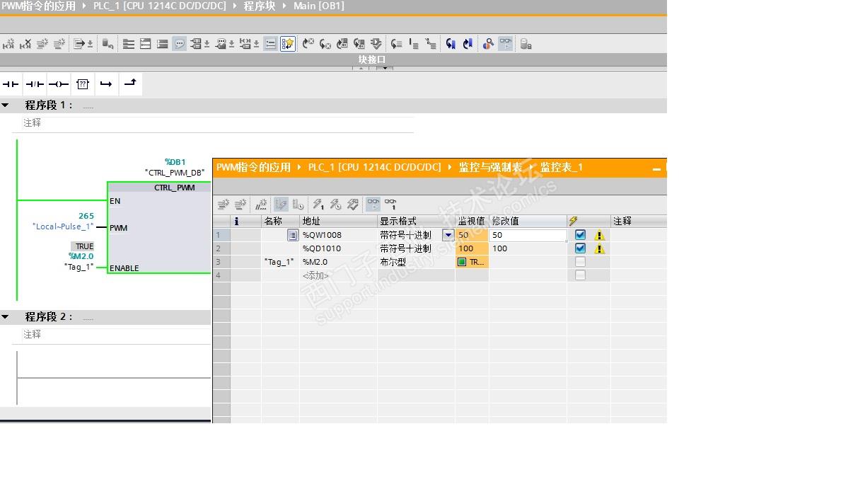 2) 连接项目测试的所有硬件连接,将 PWM硬件及指令编译、保存后下载到cpu,启动plc运行,启动状态监控:
