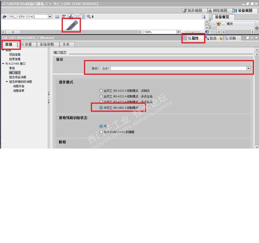 1) 创建一个新项目,组态S7-1214C+ CM1241,在“设备视图”中组态CM1241,并定义自由口通讯选项: