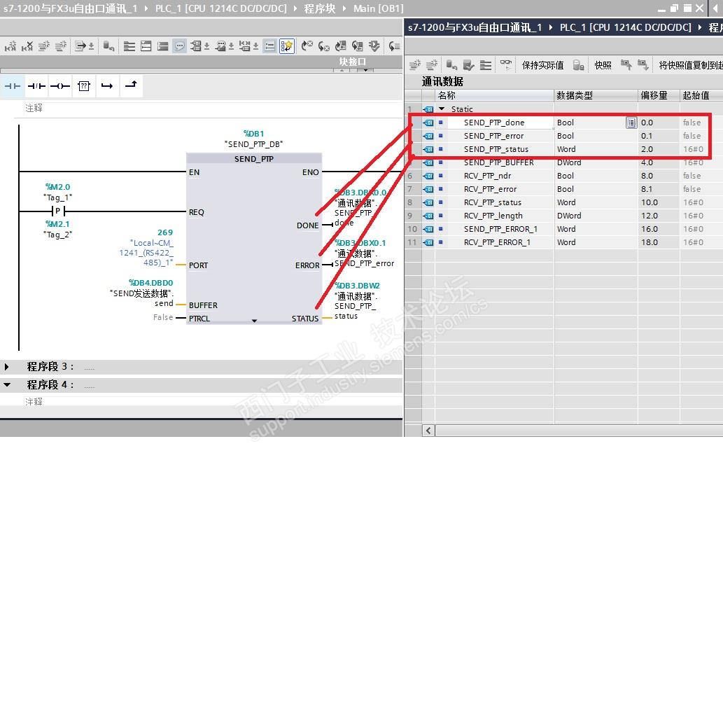 西门子S7-1214C + CM1241组成的扩展RS422/485口,与三菱FX3U – 485-DB扩展通讯板建立自由口通讯,其中: