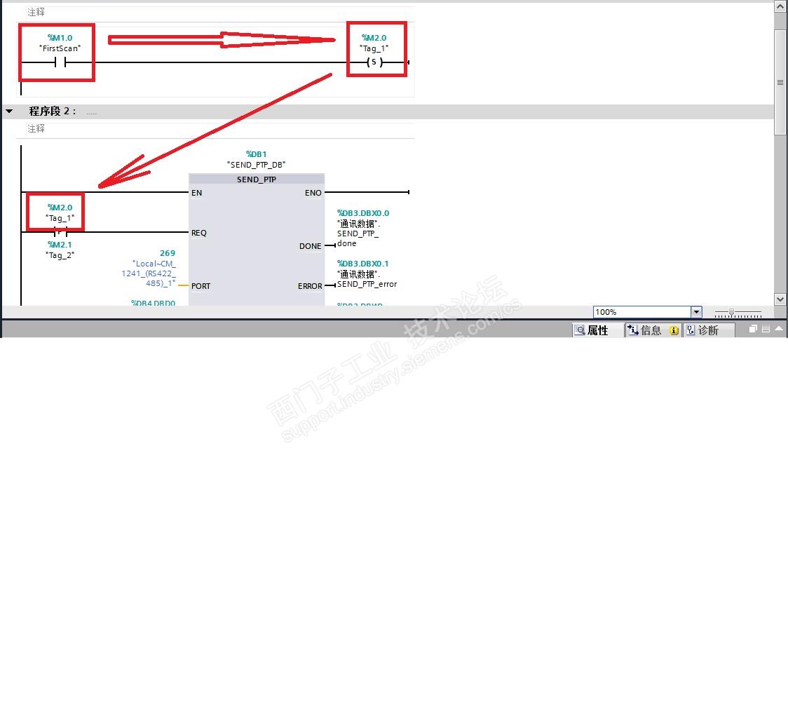 5) 再创建通讯指令的轮询调用机制,利用系统标志位"FirstScan",启动通讯发送指令SEND_PTP,再利用指令完成标志位DONE触发RCV_PTP指令,RCV_PTP指令完成标志位NDR返回到初始,构成一个闭环:再根据通讯发送、接收指令的Error及Status状态值组合,读取指令的错误信息: