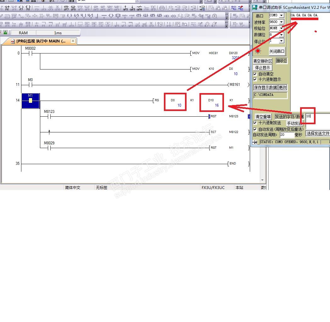 D0 = 10 发送到串口调试软件接收窗口中的数据为0A(10进制数的10),串口调试软件发送窗口写数据16#数 = 10,在D10 = 10进制的16。当M1 = 1始终接通,则RS指令一直处于接收状态,接收完成后,M8123用程序发送断开,准备下一次的接收任务,如此循环。借于三菱这个简单的程序,稍加修改就可以建立2台PLC之间的通讯。