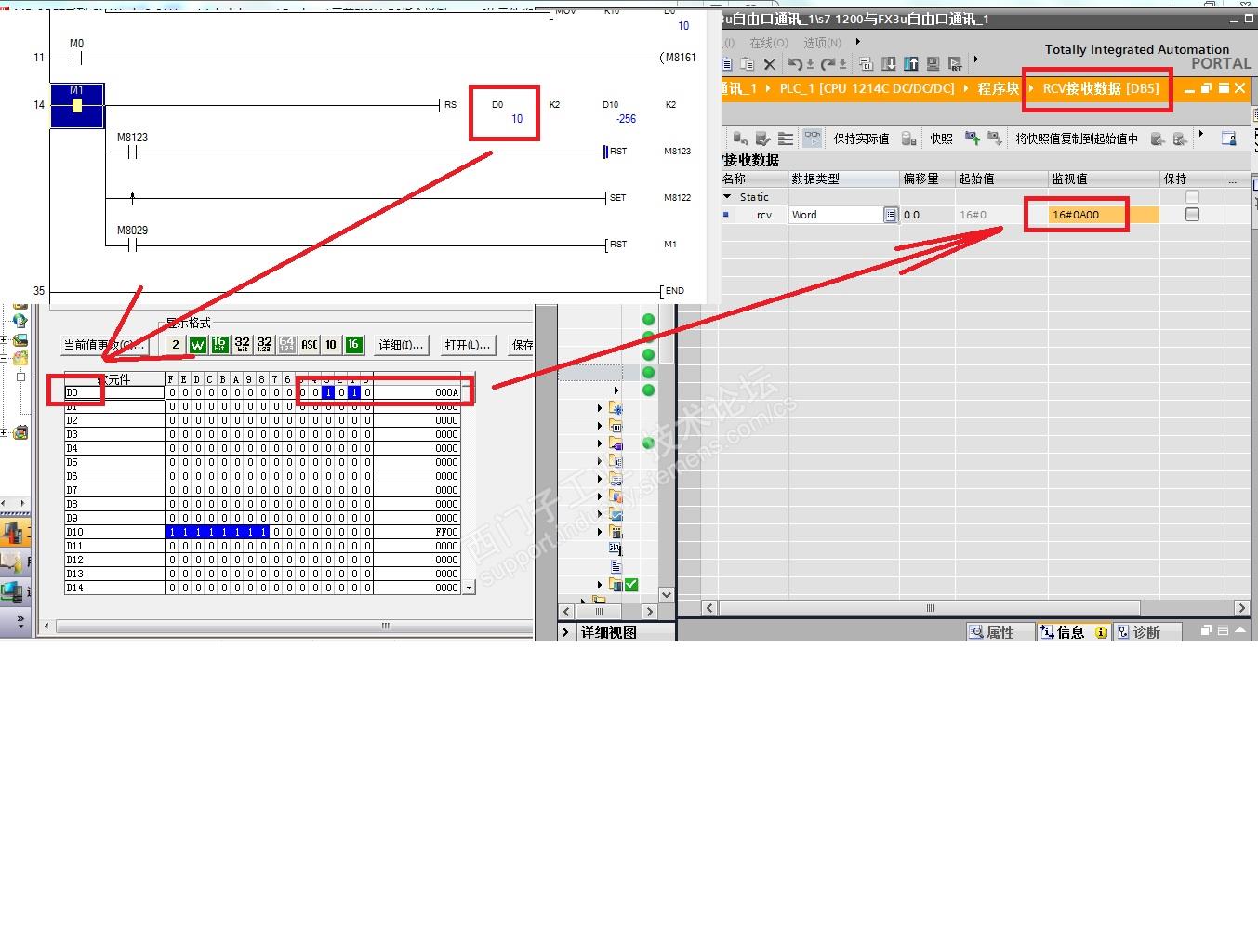 1) 将2台PLC的通讯口连接起来,假设西门子PLC首先发送一个数据,如果通讯连接正确,那么,D10会接收到来自西门子S7-1214C(CM1241)的DB4.DBD0的数据: