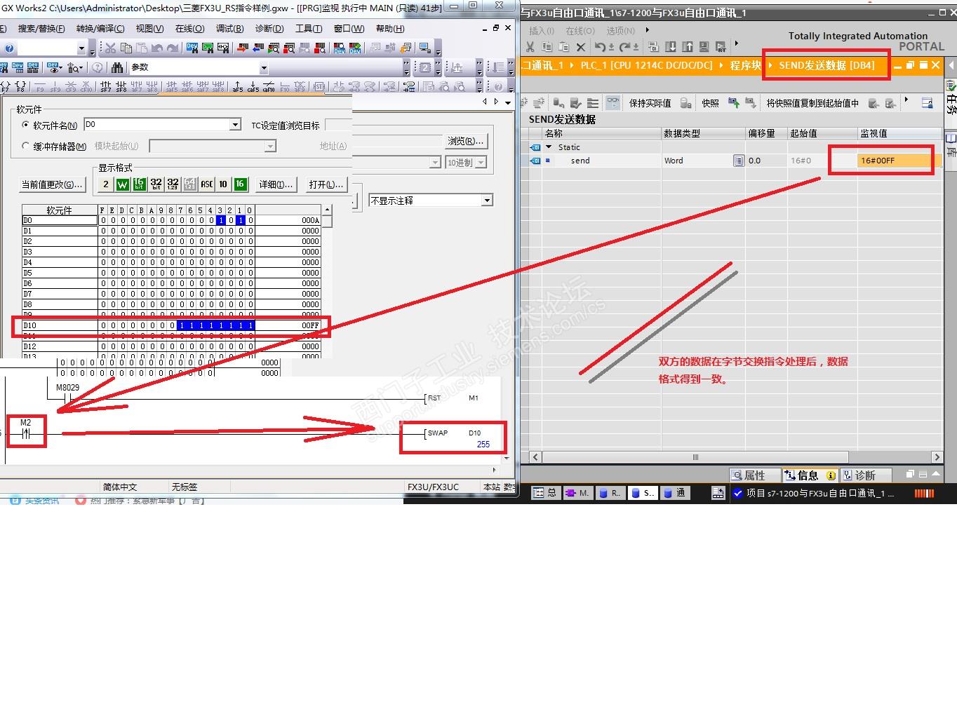 注意,三菱FX3U与西门子S7-1214C通讯数据的交换,需要在其中的一方做高低字节交换程序: