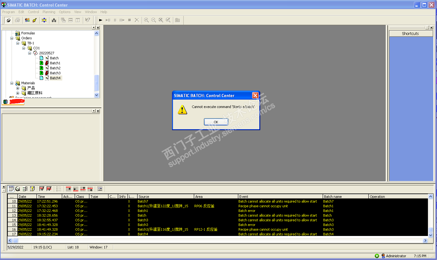 用BATCH组态好配方后,生成一个订单,点击启动后,出现”Cannot execute command 'Starts a batch'”对话框,提示的信息为“Batch cannot allocate all units required to allow start",请教下这是箭怎么引起的呢?写的有些配方没问题,有些就是启动不了。
